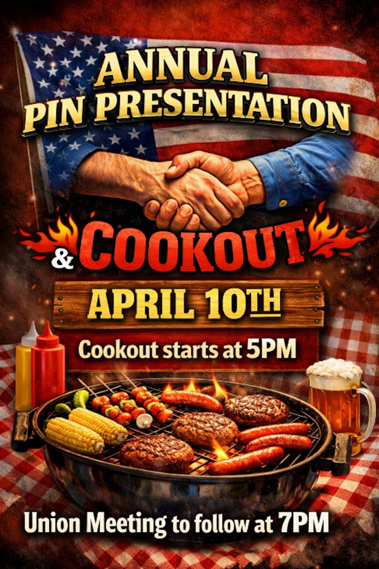 Our Annual Brother of the Year Pin Presentation and Union Meeting will be April 10th. A cookout will be held under the picnic shelters beginning at 5:00 PM, followed by the meeting at 7:00 PM. Members interested in volunteering to assist with food preparation or service are encouraged to contact Jonathan Fielder at the union office at 813-621-6451.